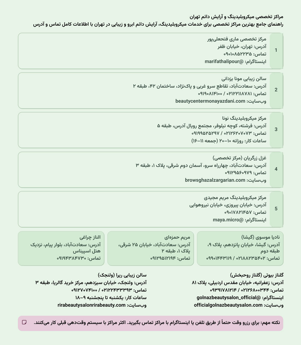 | ۵ | مرکز میکروبلیدینگ مریم مجیدی | تهران، خیابان پیروزی، خیابان نیروهوایی | — | ۰۹۰۱۷۸۲۱۴۵۷ | @maya.micro | — | — |