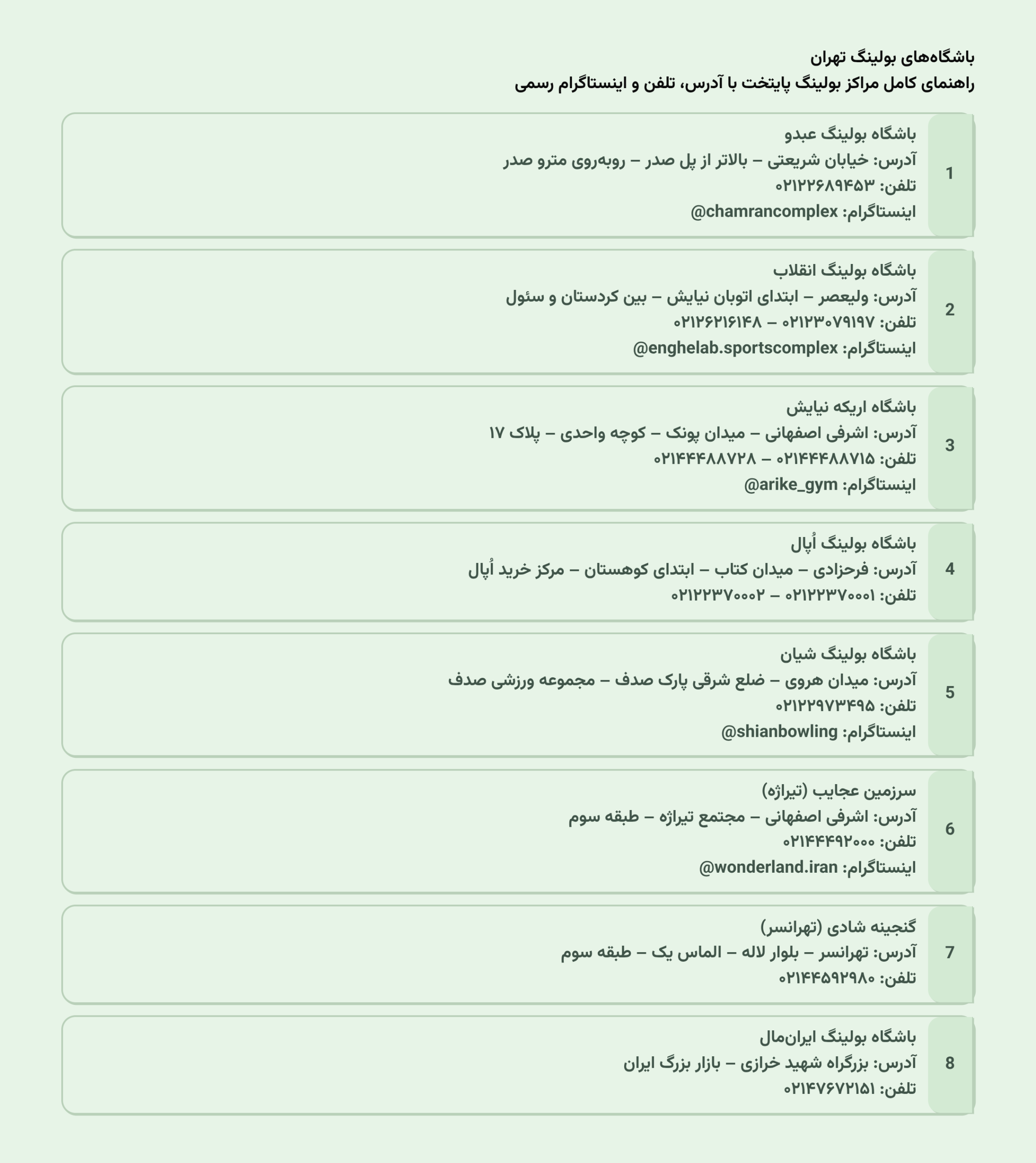 | باشگاه بولینگ انقلاب | تهران – خیابان ولیعصر (عج) – ابتدای اتوبان نیایش – حدّفاصل بزرگراه کردستان و سئول | ۰۲۱۲۳۰۷۹۱۹۷ – ۰۲۱۲۶۲۱۶۱۴۸ | enghelab.sportscomplex |